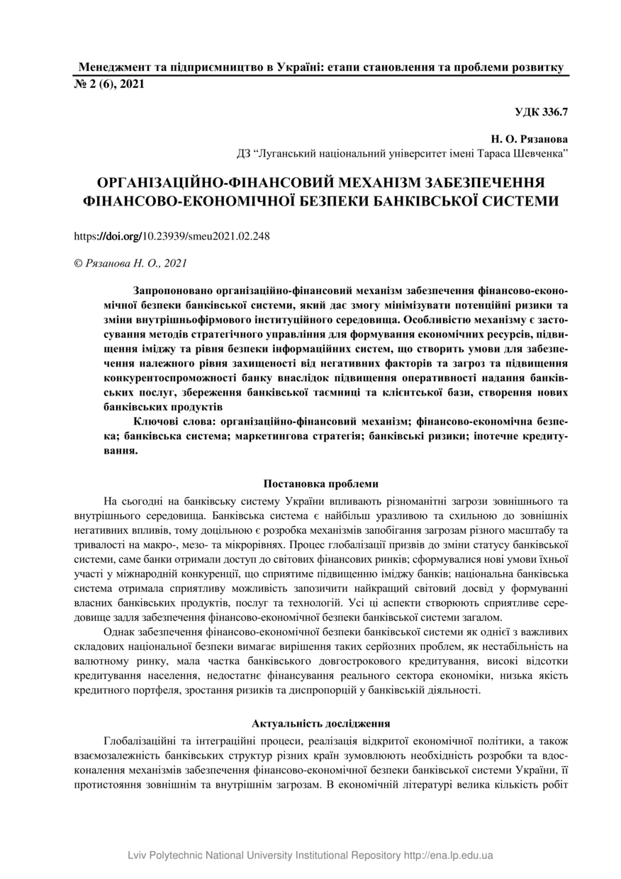 Рязанова Н. О. Організаційно-фінансових механізм забезпечення фінансово-економічної безпеки банківської системи / Н. О. Рязанова // Менеджмент та підприємництво в Україні: етапи становлення і проблеми розвитку : науковий журнал. — Львів : Видавництво Львівської політехніки, 2021. — Том 3. — № 2. — С. 248–255.