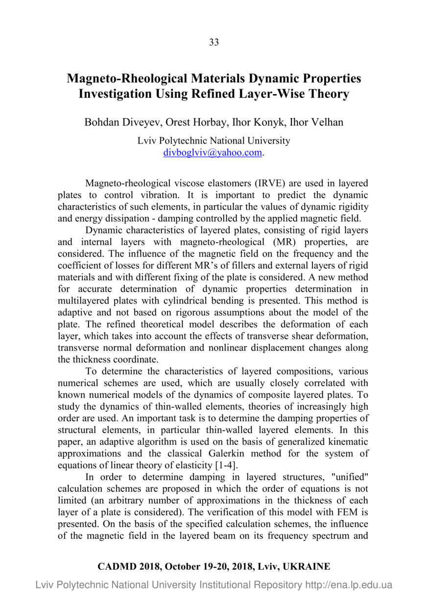 | dc.identifier.citation | Magneto-rheological materials dynamic properties investigation using refined layer-wise theory / Bohdan Diveyev, Orest Horbay, Ihor Konyk, Ihor Velhan // САПР у проектуванні машин. Задачі впровадження та навчання : матеріали XXVI Міжнародної українсько-польської науково-технічної конференції, 19-20 жовтня 2018 року, Львів. — Львів : Видавництво Львівської політехніки, 2018. — С. 33–34. | |