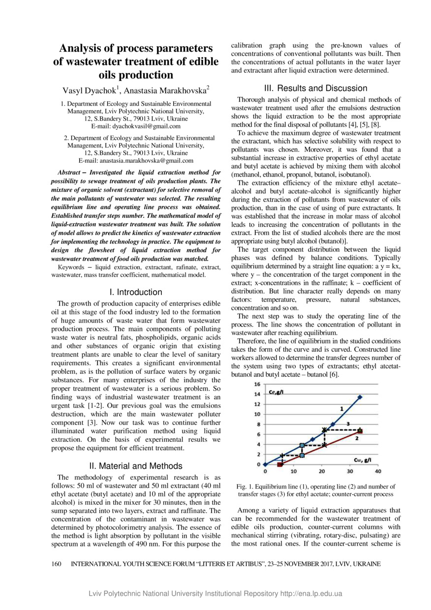 | dc.description.abstract | Investigated the liquid extraction method for possibility to sewage treatment of oils production plants. The mixture of organic solvent (extractant) for selective removal of the main pollutants of wastewater was selected. The resulting equilibrium line and operating line process was obtained. Established transfer steps number. The mathematical model of liquid-extraction wastewater treatment was built. The solution of model allows to predict the kinetics of wastewater extraction for implementing the technology in practice. The equipment to design the flowsheet of liquid extraction method for wastewater treatment of food oils production was matched. | |