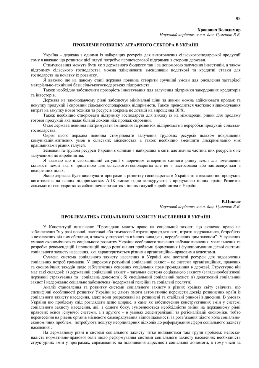 Циквас В. Проблематика соціального захисту населення в Україні / В. Циквас, В. В. Гуменюк // 77-ма Студентська науково-технічна конференція. Секція "Публічне управління та адміністрування" : збірник тез доповідей, 7 листопада 2019 року, Львів. — Львів : Видавництво Львівської політехніки, 2019. — С. 95–96. — (Економічна теорія та історія розвитку економіки).