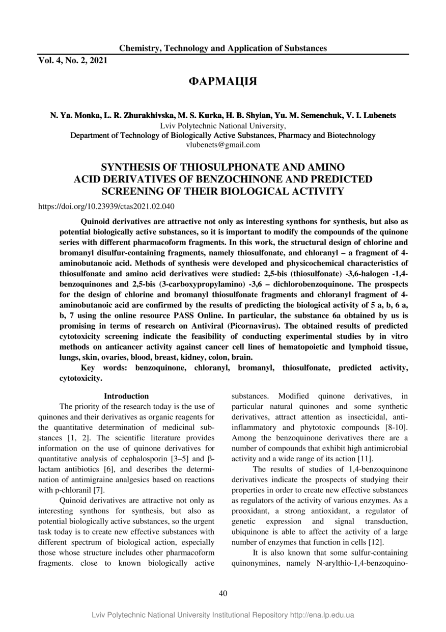 Synthesis of thiosulphonate and amino acid derivatives of benzochinone and predicted screening of their biological activity / N. Ya. Monka, L. R. Zhurakhivska, M. S. Kurka, H. B. Shyian, Yu. M. Semenchuk, V. I. Lubenets // Chemistry, Technology and Application of Substances. — Lviv : Lviv Politechnic Publishing House, 2021. — Vol 4. — No 2. — P. 40–46.