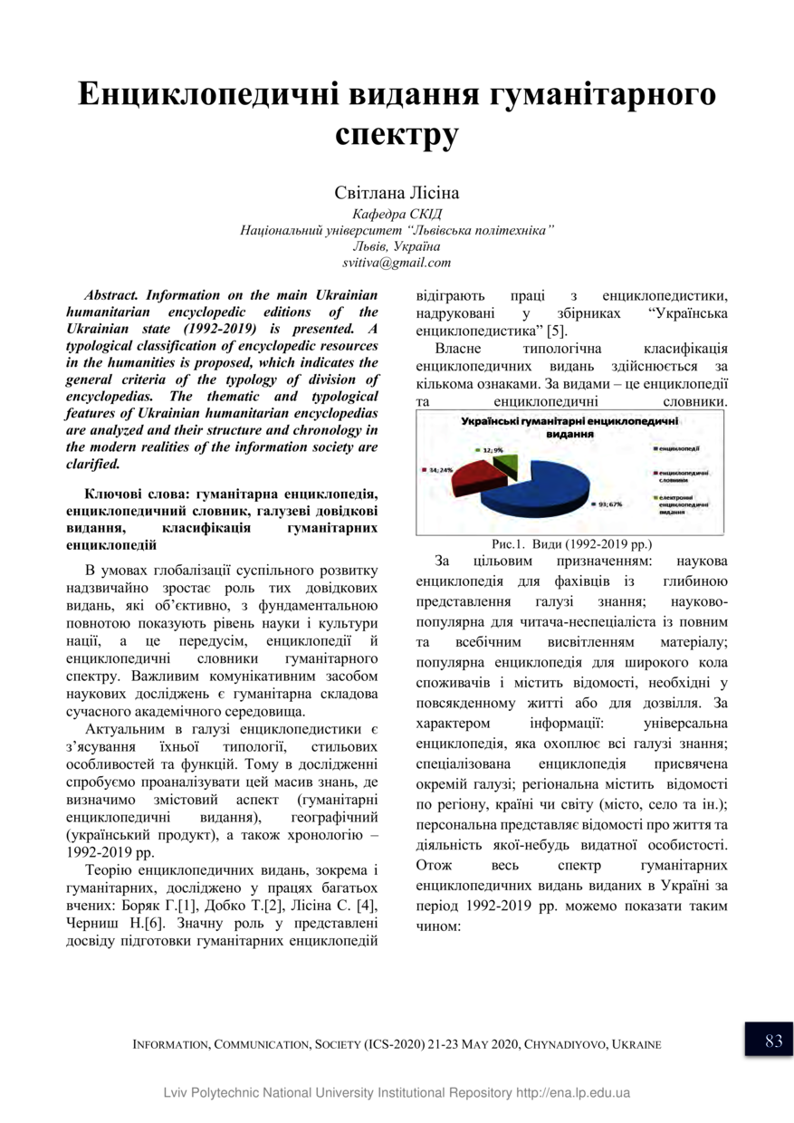 | dc.identifier.citationen | Lisina S. Entsyklopedychni vydannia humanitarnoho spektru / Svitlana Lisina // Informatsiia, komunikatsiia, suspilstvo 2020 : materialy 9-yi Mizhnarodnoi naukovoi konferentsii, 21–23 travnia 2020 roku, Lviv. — Lviv : Lviv Politechnic Publishing House, 2020. — P. 83–84. — (Bibliotechna, arkhivna ta muzeina diialnist v umovakh rozvytku informatsiinoho suspilstva). | |