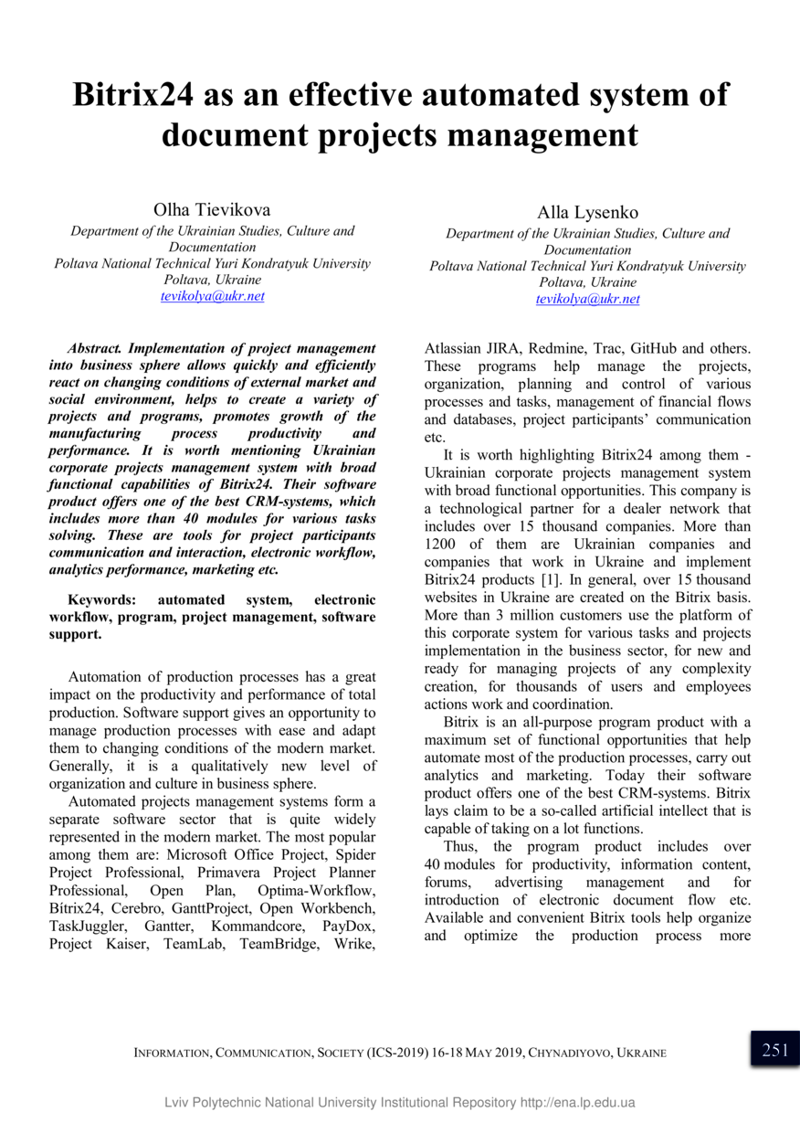 Tievikova O. Bitrix24 as an effective automated system of document projects management / Olha Tievikova, Alla Lysenko // Інформація, комунікація, суспільство 2019 : матеріали 8-ої Міжнародної наукової конференції ІКС-2019, 16-18 травня 2019 року, Чинадієво. — Львів : Видавництво Львівської політехніки, 2019. — С. 251–252. — (Технології інформаційного менеджменту та інтелектуального опрацювання даних).