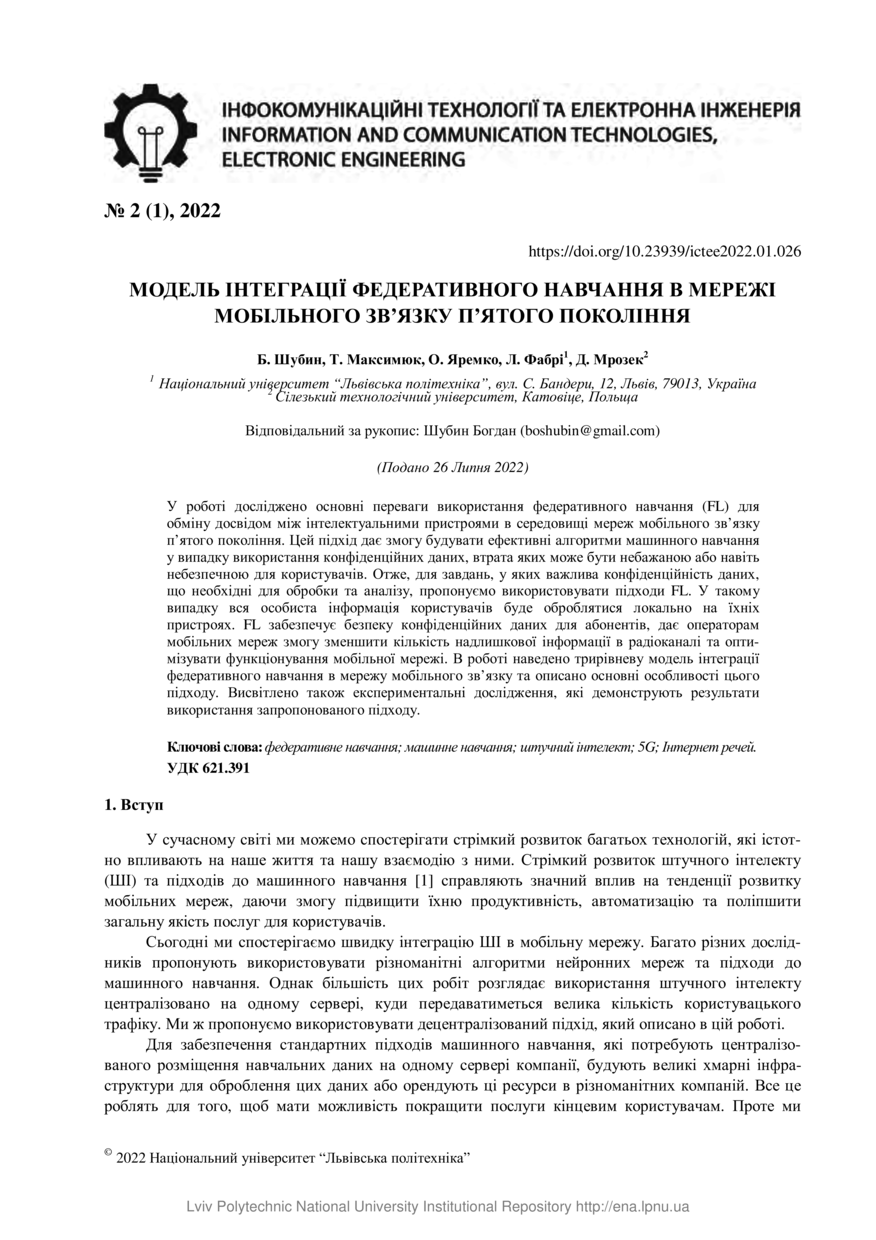 | dc.identifier.citation | Модель інтеграції федеративного навчання в мережі мобільного зв’язку п’ятого покоління / Б. Шубин, Т. Максимюк, О. Яремко, Л. Фабрі, Д. Мрозек // Інфокомунікаційні технології та електронна інженерія. — Львів : Видавництво Львівської політехніки, 2022. — Том 2. — № 1. — С. 26–35. | |