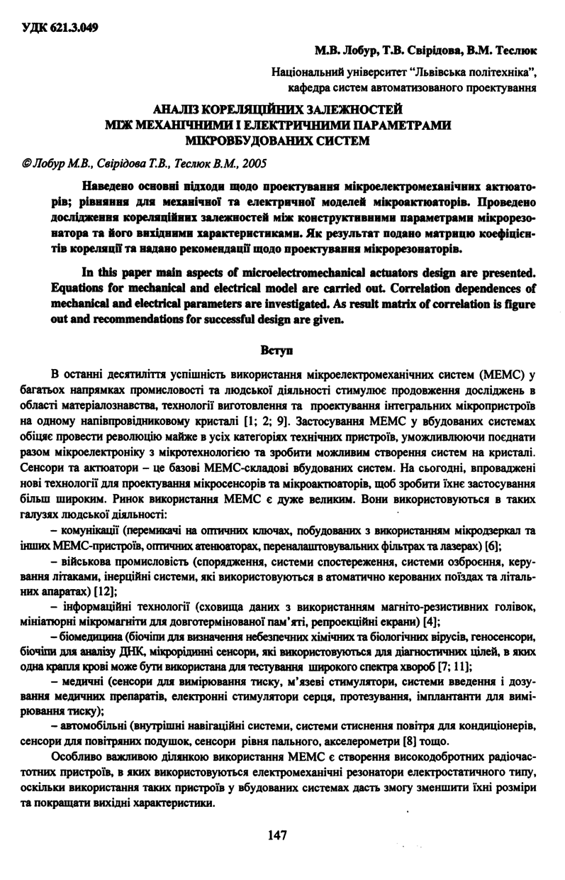 Лобур М. В. Аналіз кореляційних залежностей між механічними і електричними параметрами мікровбудованих систем / М. В. Лобур, Т. В. Свірідова, В. М. Теслюк // Вісник Національного університету “Львівська політехніка”. — Львів : Видавництво Національного університету “Львівська політехніка”, 2005. — № 534 : Радіоелектроніка та телекомунікації. — С. 147–152. — (Математичне моделювання та комп’ютерні технології).
