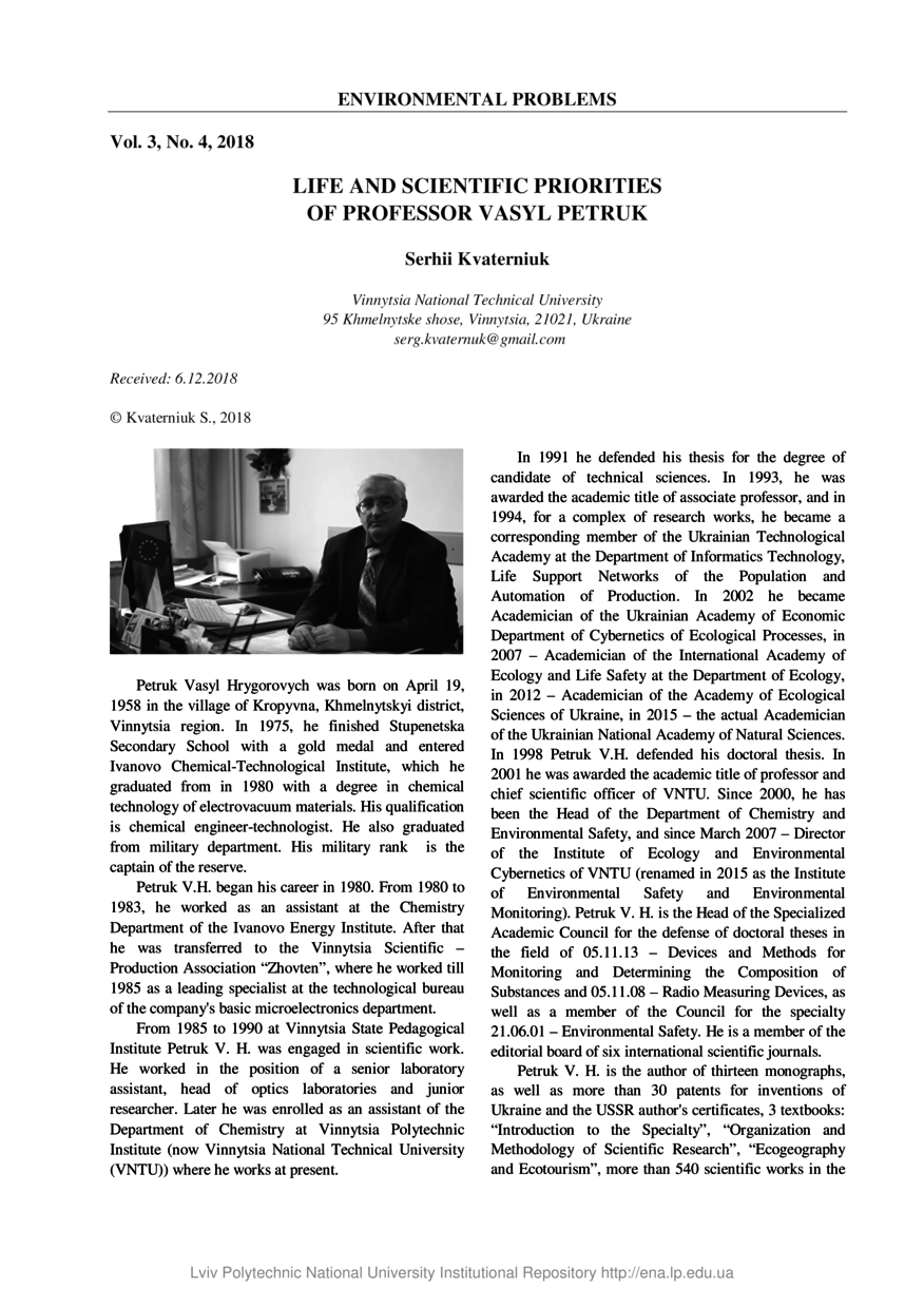 | dc.identifier.citationen | Kvaterniuk S. Life and scientific priorities of Professor Vasyl Petruk / Serhii Kvaterniuk // Environmental problems. — Lviv : Lviv Politechnic Publishing House, 2018. — Vol 3. — No 4. — P. 252–257. | |