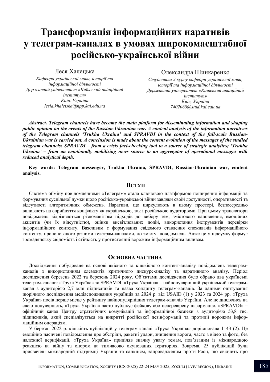 Халецька Л. Трансформація інформаційних наративів у телеграм-каналах в умовах широкомасштабної російсько-української війни / Леся Халецька, Олександра Шинкаренко // Інформація, комунікація, суспільство 2025: ICS-2025 : матеріали XIV Міжнародної наукової конференції, 22-24 травня 2025 року, Львів. — Львів : Видавництво Львівської політехніки, 2025. — С. 185–186. — (Соціальні комунікації).