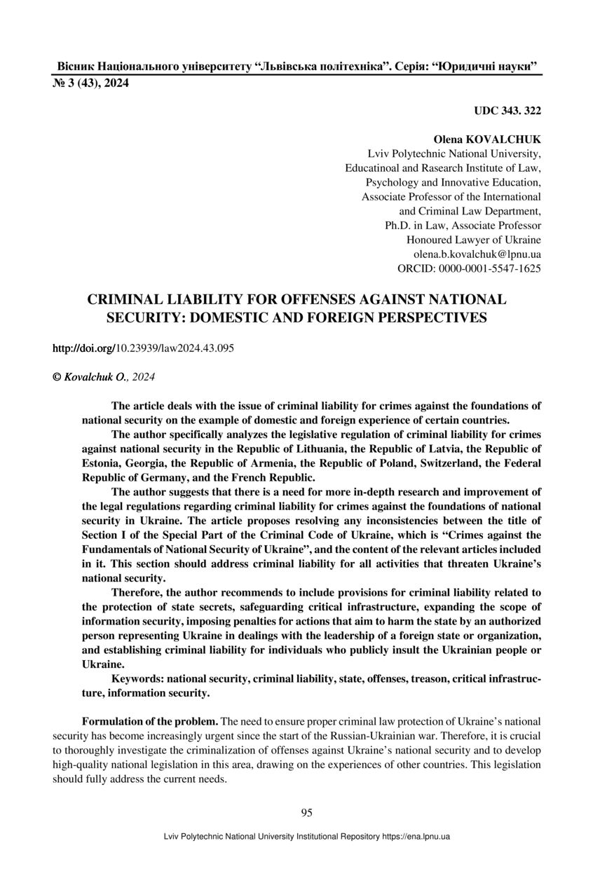 Kovalchuk O. Criminal liability for offenses against national security: domestic and foreign perspectives / Olena Kovalchuk // Вісник Національного університету “Львівська політехніка”. Серія: “Юридичні науки”. — Lviv : Lviv Politechnic Publishing House, 2024. — No 3(43). — P. 95–100.