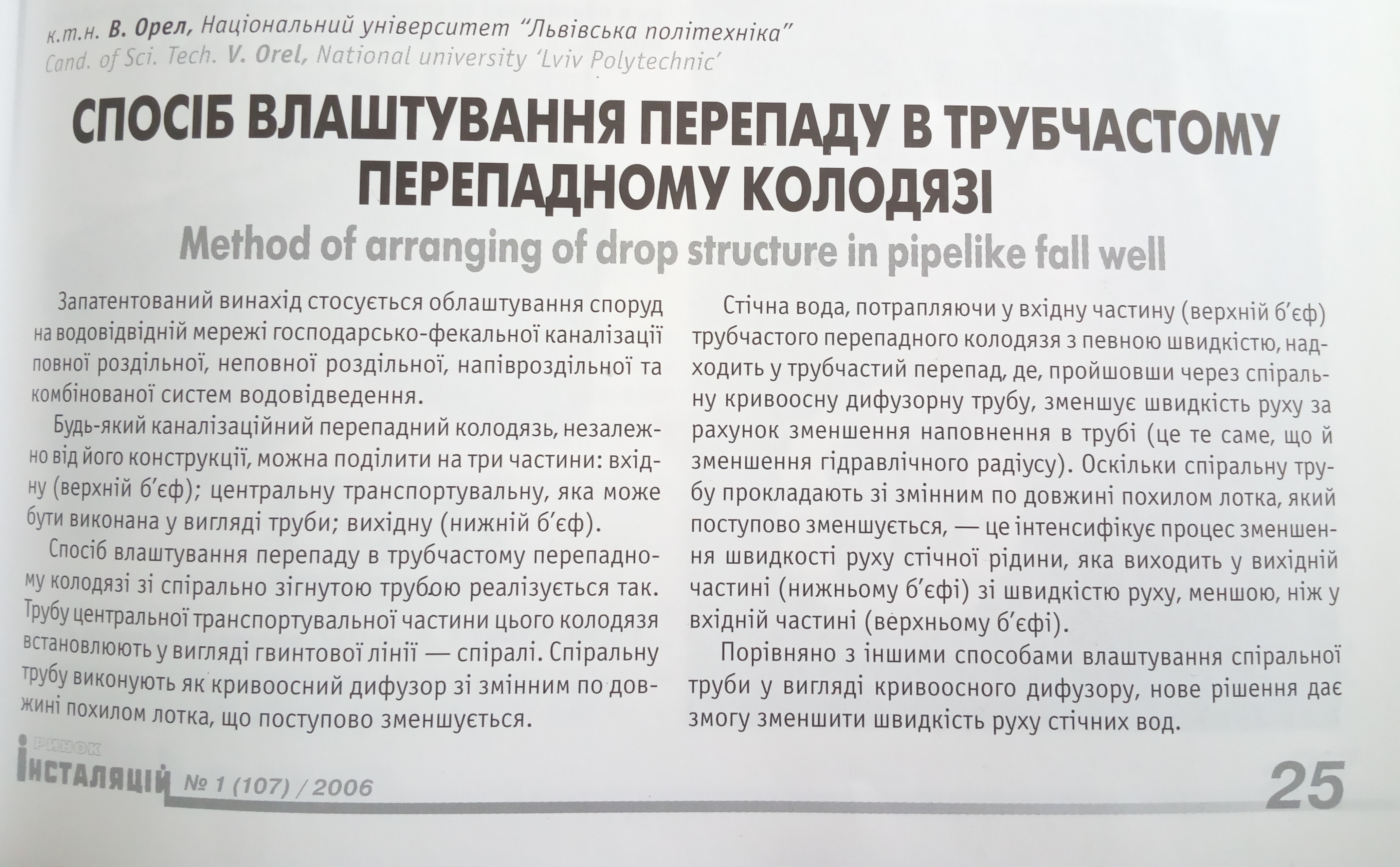 Орел В. Спосіб влаштування перепаду в трубчастому перепадному колодязі / В. Орел // Ринок інсталяцій. – 2006. – № 1. – С. 25.