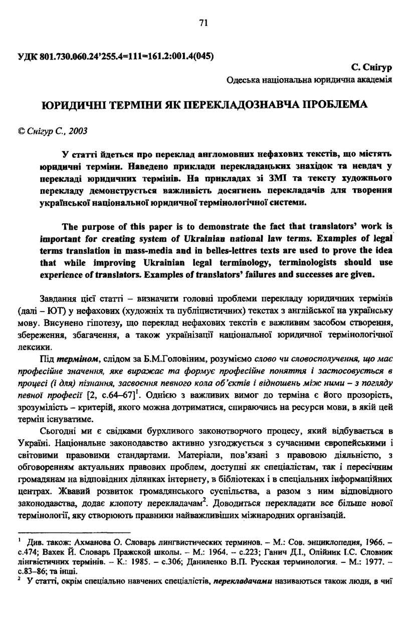 Снігур С. Юридичні терміни як перекладознавча проблема / С. Снігур // Вісник Національного університету “Львівська політехніка”. — Львів : Видавництво Національного університету “Львівська політехніка”, 2003. — № 490 : Проблеми української термінології. — С. 71–75. — (Лексикографія та міжмовні зв’язки).