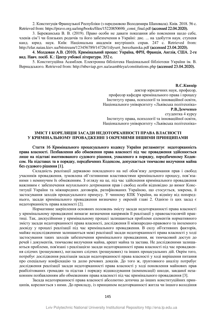 Канцір В. С. Зміст і кореляція засади недоторканності права власності у кримінальному провадженні з окремими іншими принципами / В. С. Канцір, Р. В. Демченко // Захист прав і свобод людини та громадянина в умовах формування правової держави : збірник тез ІХ Всеукраїнської науково-практичної конференції, 30 травня 2020 року, Львів. — Львів : Видавництво Львівської політехніки, 2020. — С. 145–146. — (Кримінально-правові аспекти захисту прав і свобод людини та громадянина в умовах формування правової держави).