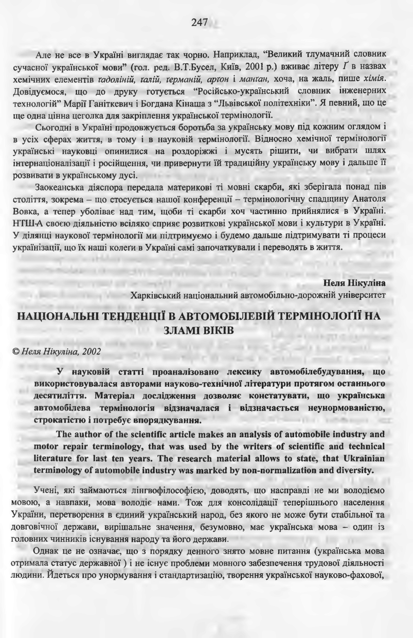 Нікуліна Н. Національні тенденції в автомобілевій термінології на зламі віків / Неля Нікуліна // Вісник Національного університету “Львівська політехніка”. — Львів : Видавництво Національного університету “Львівська політехніка”, 2002. — № 453 : Проблеми української термінології. — С. 247–250. — (Термінологія природничих знань).