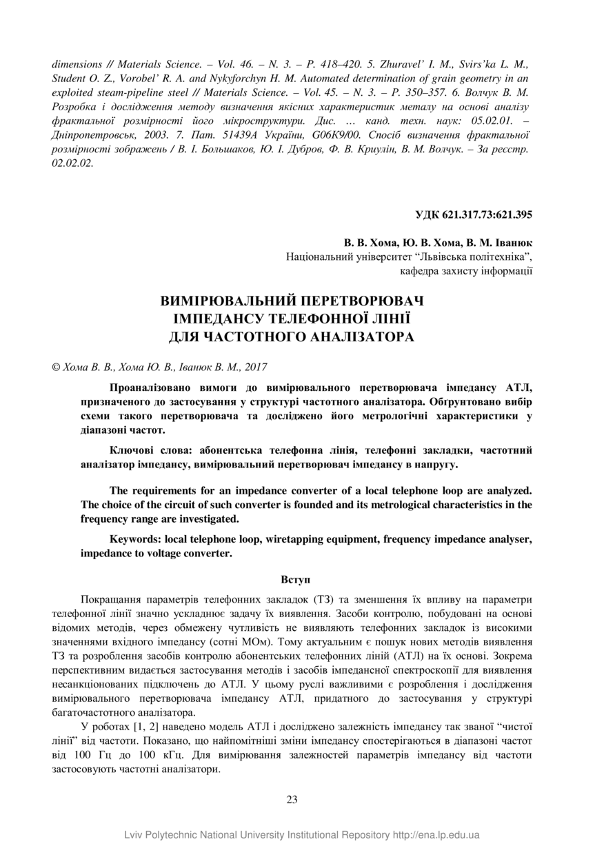 Хома В. В. Вимірювальний перетворювач імпедансу телефонної лінії для частотного аналізатора / В. В. Хома, Ю. В. Хома, В. М. Іванюк // Вісник Національного університету «Львівська політехніка». Серія: Автоматика, вимірювання та керування. — Львів : Видавництво Львівської політехніки, 2017. — № 880. — С. 23–31.
