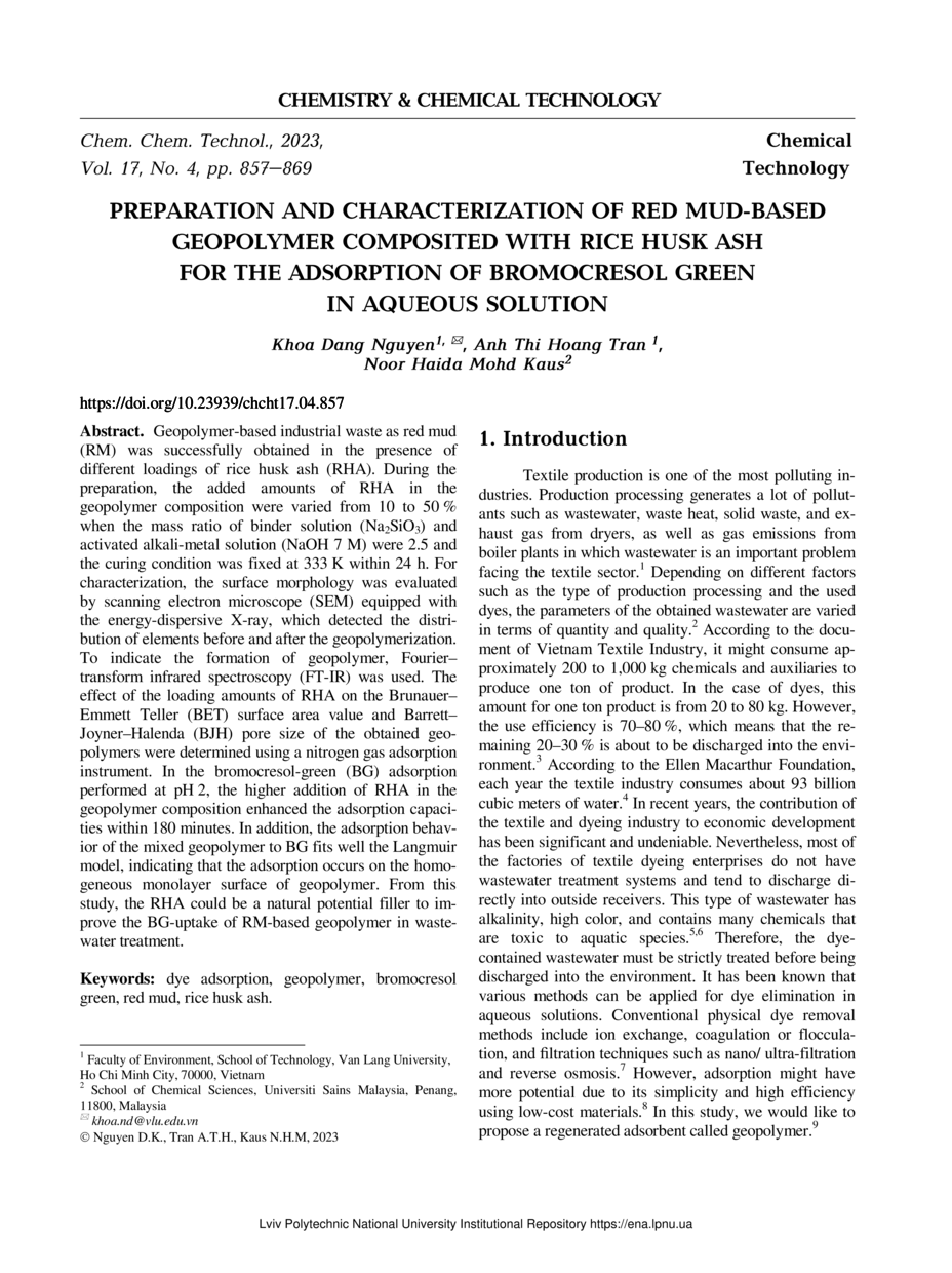 | dc.identifier.citation | Nguyen K. D. Preparation and Characterization of Red Mud-Based Geopolymer Composited with Rice Husk Ash for the Adsorption of Bromocresol Green in Aqueous Solution / Khoa Dang Nguyen, Anh Thi Hoang Tran, Noor Haida Mohd Kaus // Chemistry & Chemical Technology. — Lviv : Lviv Politechnic Publishing House, 2023. — Vol 17. — No 4. — P. 857–869. | |