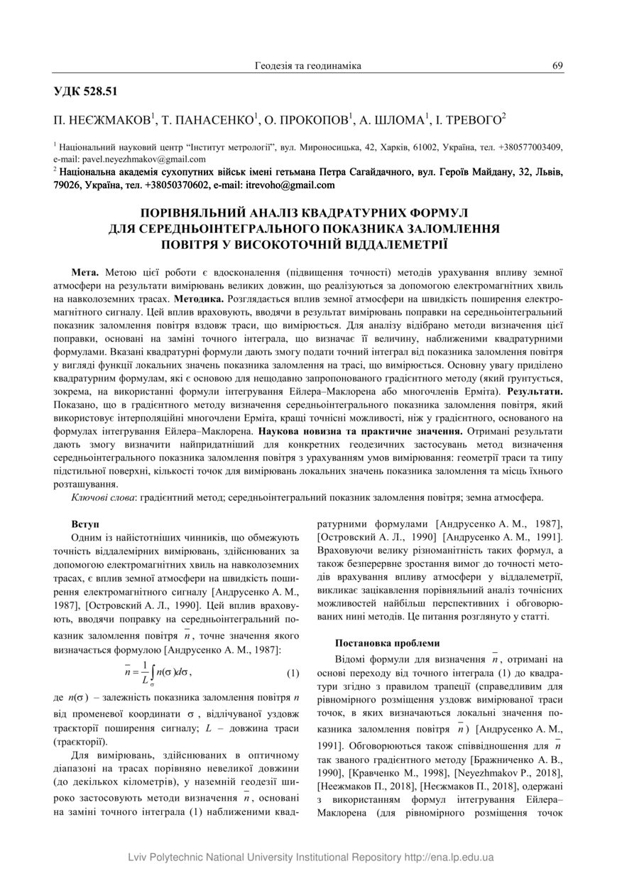 Порівняльний аналіз квадратурних формул для середньоінтегрального показника заломлення повітря у високоточній віддалеметрії / П. Неєжмаков, Т. Панасенко, О. Прокопов, А. Шлома, І. Тревого // Сучасні досягнення геодезичної науки та виробництва. — Львів : Видавництво Львівської політехніки, 2020. — Том 1(39). — С. 69–73.
