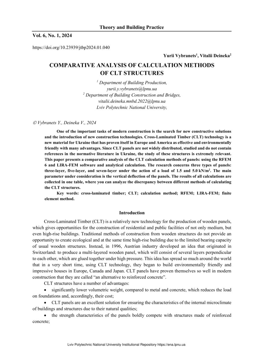 Vybranets Y. Comparative analysis of calculation methods of CLT structures / Yurii Vybranets, Vitalii Deineka // Theory and Building Practice. — Lviv : Lviv Politechnic Publishing House, 2024. — Vol 6. — No 1. — P. 40–48.