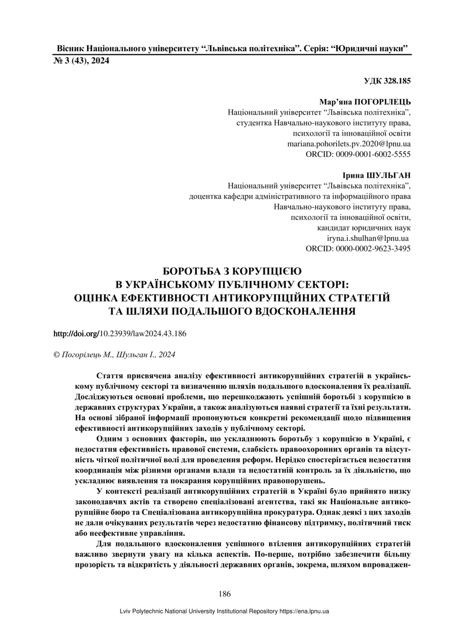 | dc.identifier.citation | Погорілець М. Боротьба з корупцією в українському публічному секторі: оцінка ефективності антикорупційних стратегій та шляхи подальшого вдосконалення / Мар’яна Погорілець, Ірина Шульган // Вісник Національного університету “Львівська політехніка”. Серія: “Юридичні науки”. — Львів : Видавництво Львівської політехніки, 2024. — № 3(43). — С. 186–193. | |