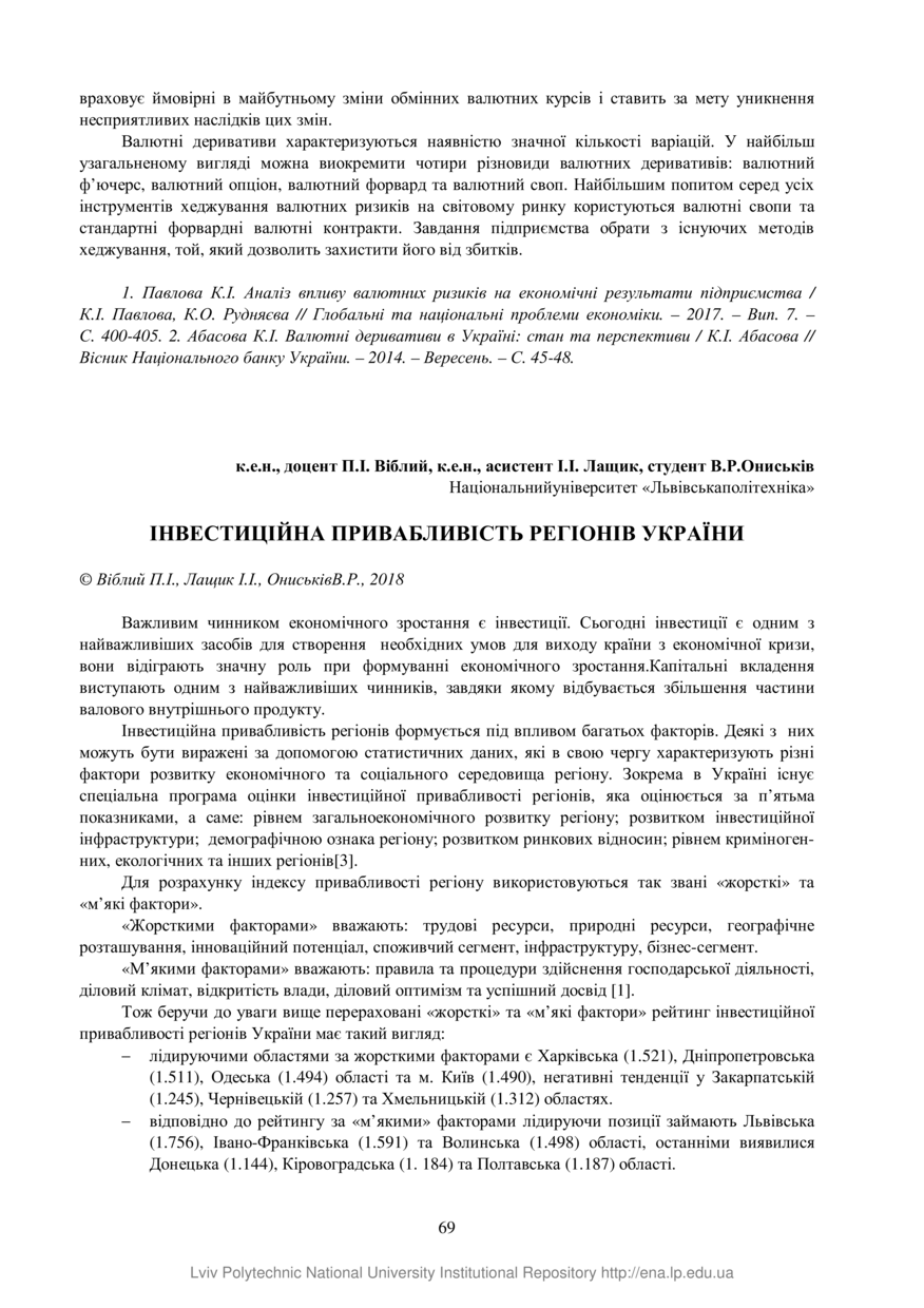 Віблий П. І. Інвестиційна привабливість регіонів України / П. І. Віблий, І. І. Лащик, В. Р. Ониськів // Проблеми економіки, фінансів та управління експортно-імпортною діяльністю : матеріали ІІІ Міжнародної науково-практичної інтернет-конференції, 16 травня 2018 року