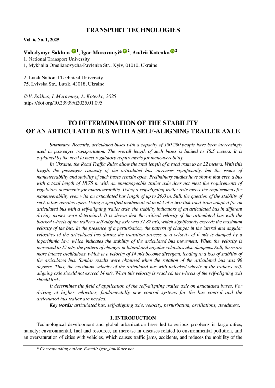 Sakhno V. To determination of the stability of an articulated bus with a self-aligning trailer axle / Volodymyr Sakhno, Igor Murovanyi, Andrii Kotenko // Transport Technologies. — Lviv : Lviv Politechnic Publishing House, 2025. — Vol 6. — No 1. — P. 95–110.