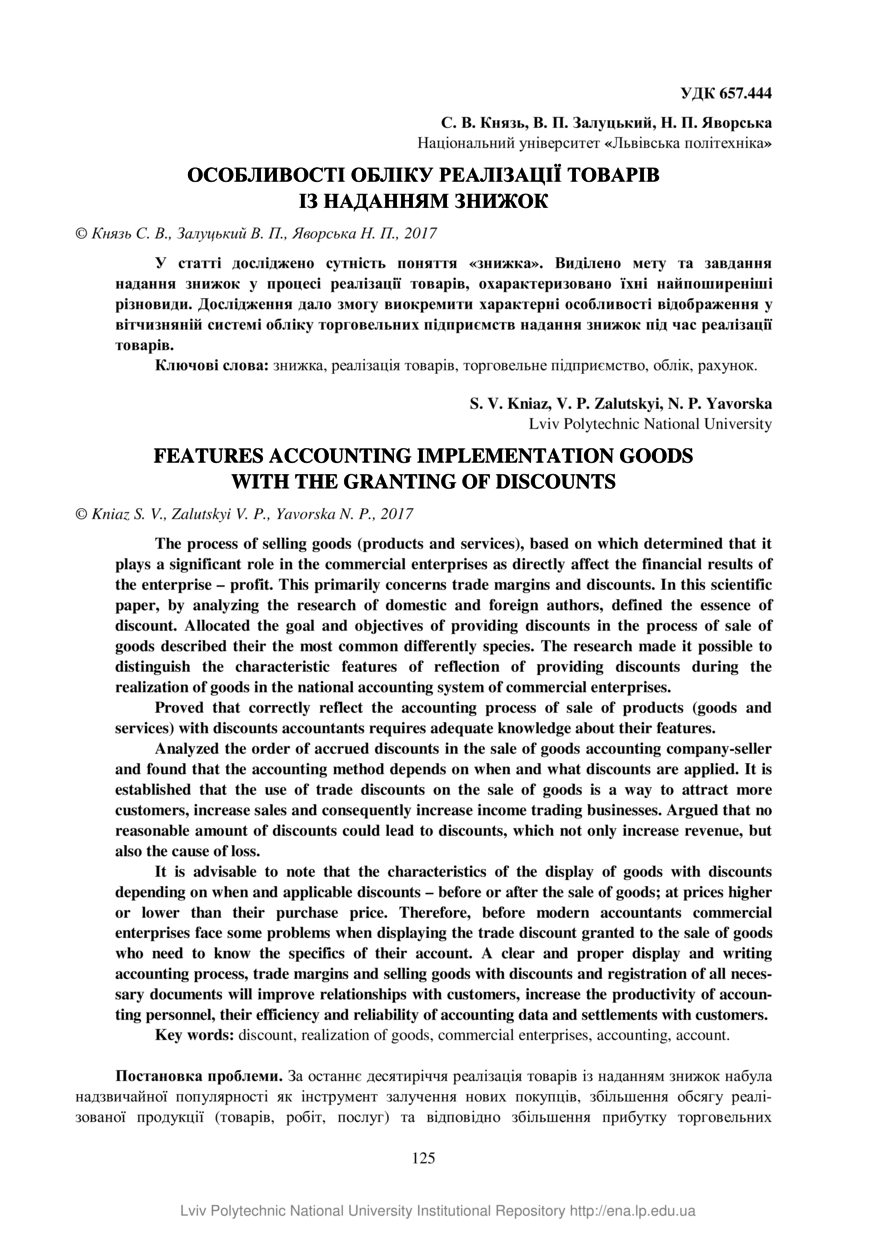 Князь С. В. Особливості обліку реалізації товарів із наданням знижок / С. В. Князь, В. П. Залуцький, Н. П. Яворська // Вісник Національного університету "Львівська політехніка". Серія : Менеджмент та підприємництво в Україні: етапи становлення і проблеми розвитку : збірник наукових праць. — Львів : Видавництво Львівської політехніки, 2017. — № 862. — С. 125–130.