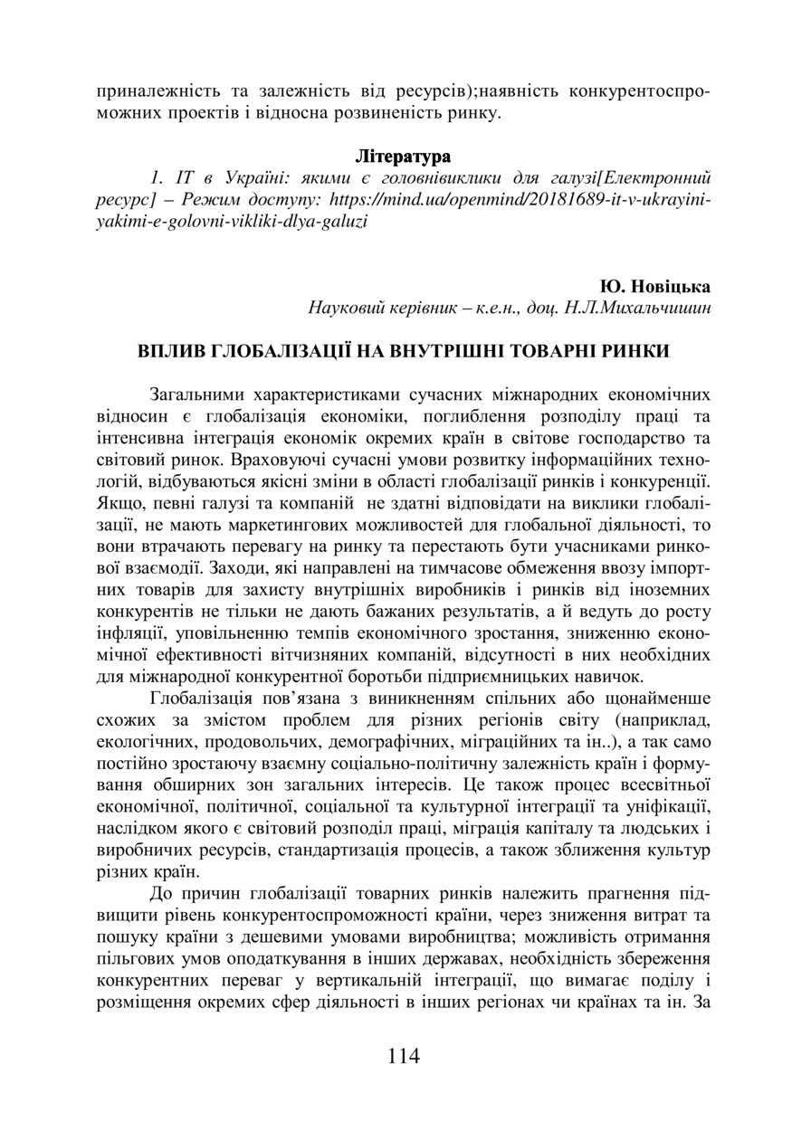 Новіцька Ю. Вплив глобалізації на внутрішні товарні ринки / Ю. Новіцька, Н. Л. Михальчишин // 76-та Студентська науково-технічна конференція. Секція "Публічне управління та адміністрування" : збірник тез доповідей, 7 листопада 2018 року, Львів. — Львів : Видавництво Львівської політехніки, 2018. — С. 114–115.