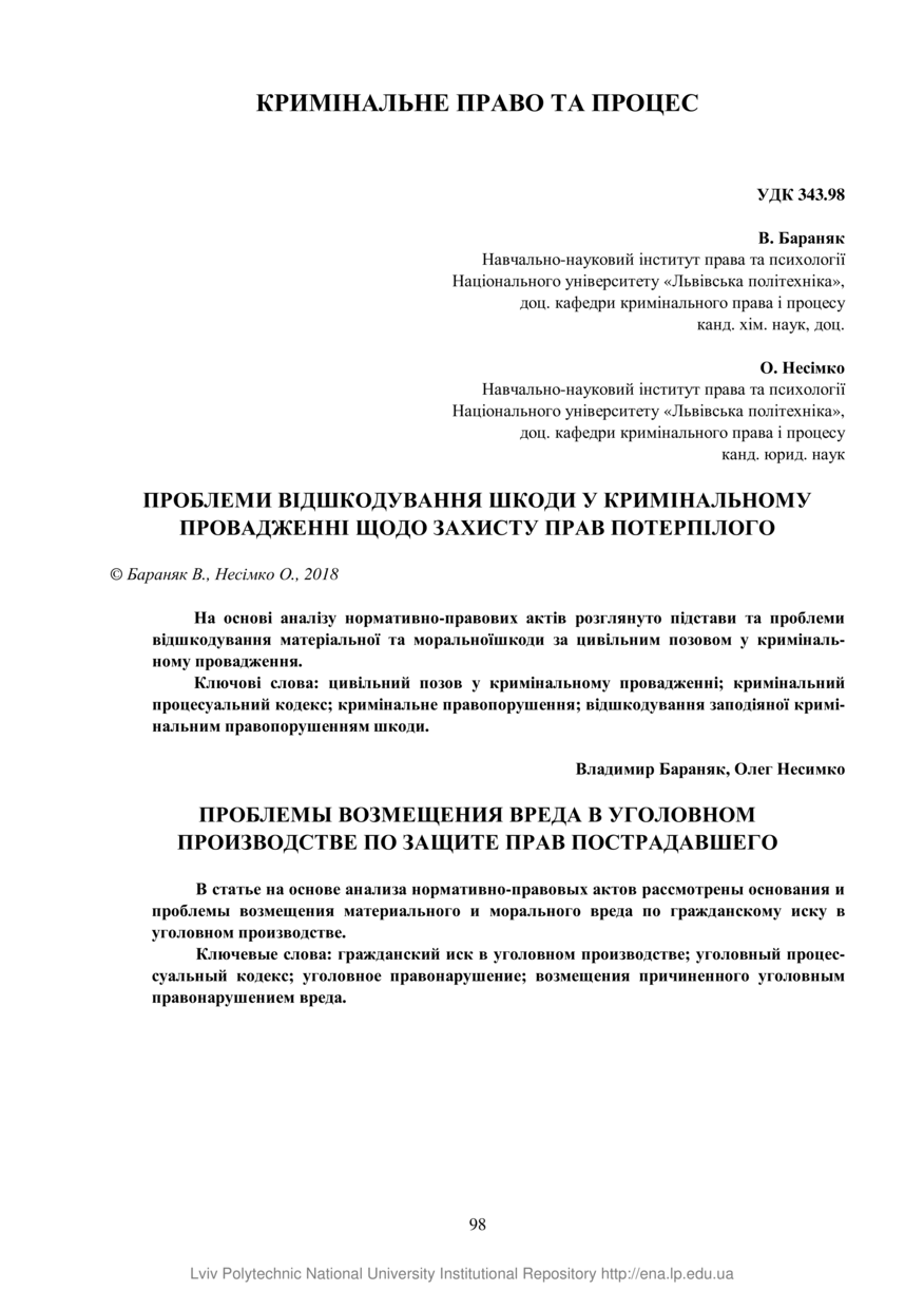 Бараняк В. Проблеми відшкодування шкоди у кримінальному провадженні щодо захисту прав потерпілого / В. Бараняк, О. Несімко // Вісник Національного університету “Львівська політехніка”. Серія: Юридичні науки. — Львів : Видавництво Львівської політехніки, 2018. — № 894, випуск 18. — С. 98–103. — (Кримінальне право та процес).