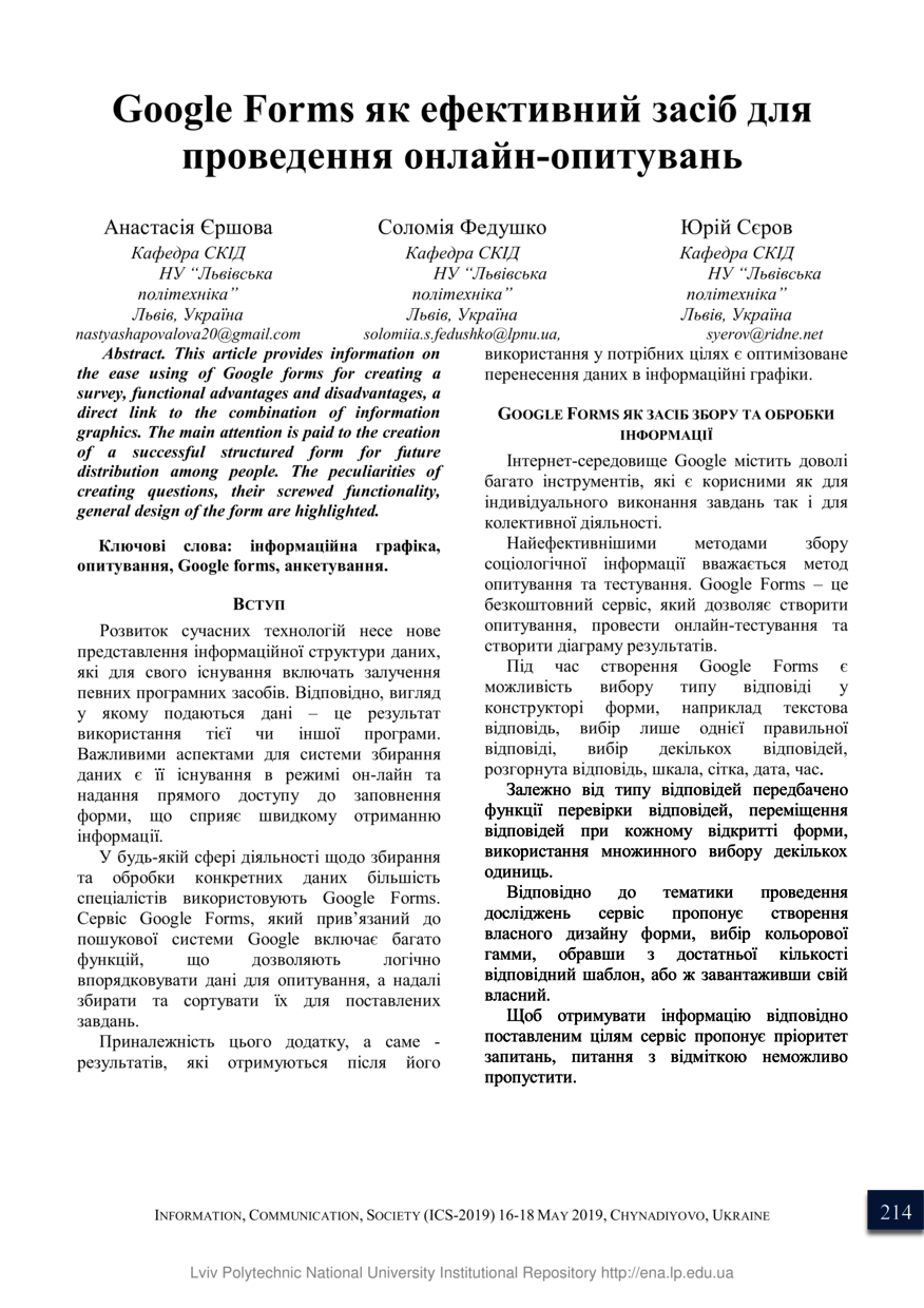 Єршова А. Google Forms як ефективний засіб для проведення онлайн-опитувань / Анастасія Єршова, Соломія Федушко, Юрій Сєров // Інформація, комунікація, суспільство 2019 : матеріали 8-ої Міжнародної наукової конференції ІКС-2019, 16-18 травня 2019 року, Чинадієво. — Львів : Видавництво Львівської політехніки, 2019. — С. 214–215. — (Соціальні комунікації).