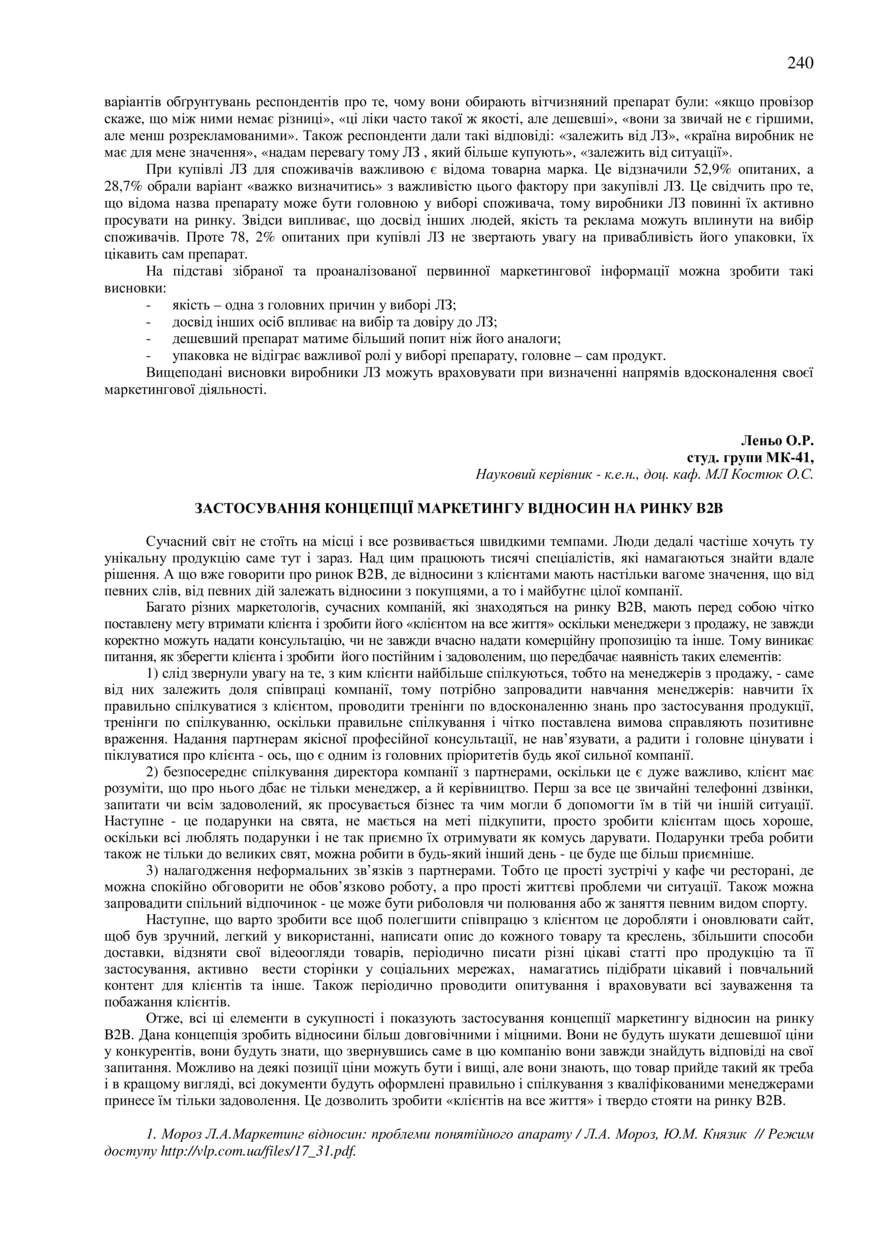 Леньо О. Р. Застосування концепції маркетингу відносин на ринку B2B / О. Р. Леньо, О. С. Костюк // 76-та Студентська науково-технічна конференція. Секція "Економіка і менеджмент" : збірник тез доповідей, жовтень – листопад 2018 року. — Львів : Видавництво Львівської політехніки, 2018. — С. 240. — (Маркетинг в структурі управління підприємством в умовах цифрової економіки).
