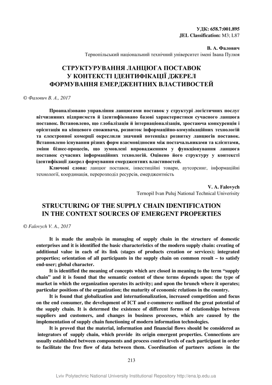| dc.identifier.citationen | Falovich V. A. Structuring of the supply chain identification in the context sources of emergent properties / V. A. Falovich // Visnyk Natsionalnoho universytetu "Lvivska politekhnika". Serie: Lohistyka. — Lviv : Vydavnytstvo Lvivskoi politekhniky, 2017. — No 863. — P. 213–232. | |