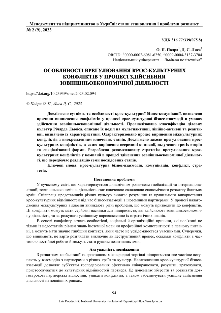 Подра О. П. Особливості врегулювання крос-культурних конфліктів у процесі здійснення зовнішньоекономічної діяльності / О. П. Подра, Д. С. Лиса // Менеджмент та підприємництво в Україні: етапи становлення і проблеми розвитку. — Львів : Видавництво Львівської політехніки, 2023. — Том 5. — № 2. — С. 94–103.