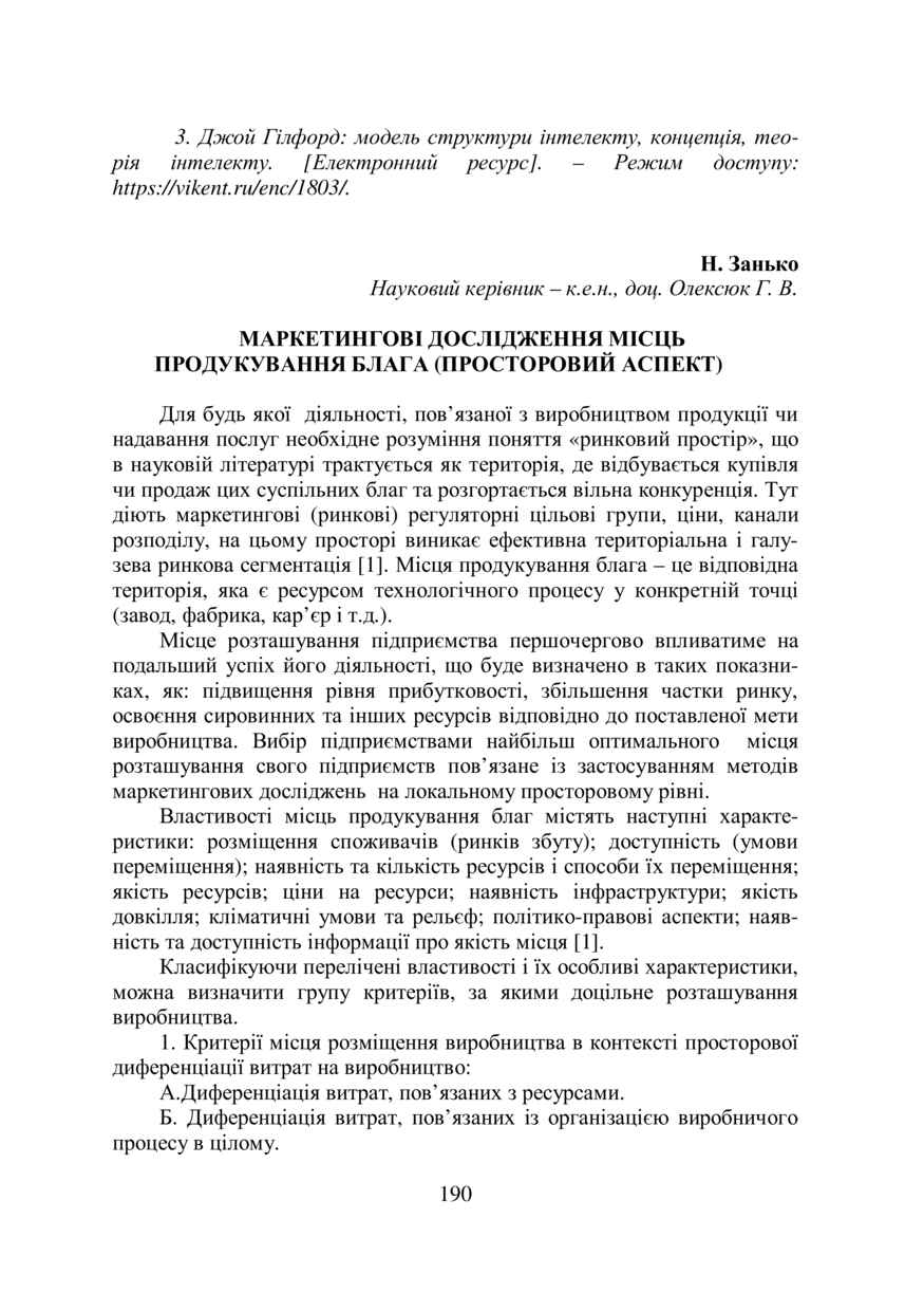 Занько Н. Маркетингові дослідження місць продукування блага (просторовий аспект) / Н. Занько, Г. В. Олексюк // 76-та Студентська науково-технічна конференція : збірник тез доповідей, жовтень 2018 року, Львів. — Львів : Видавництво Львівської політехніки, 2018. — С. 190–191. — (Секція підприємництва та перспективних технологій).