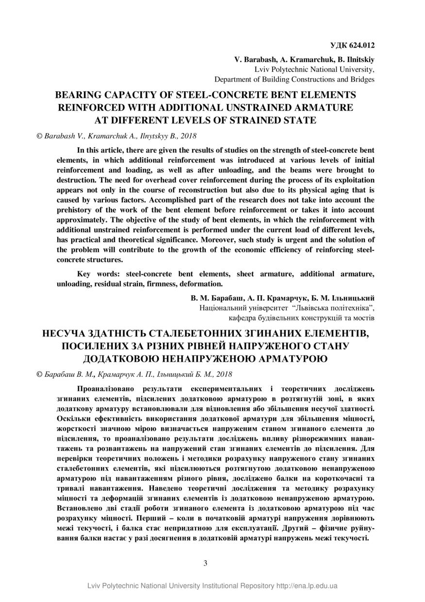 | dc.identifier.citation | Barabash V. Bearing capacity of steel-concrete bent elements reinforced with additional unstrained armature at different levels of strained state / V. Barabash, A. Kramarchuk, B. Ilnitskiy // Вісник Національного університету “Львівська політехніка”. Серія: Теорія і практика будівництва. — Львів : Видавництво Львівської політехніки, 2018. — № 888. — С. 3–11. | |