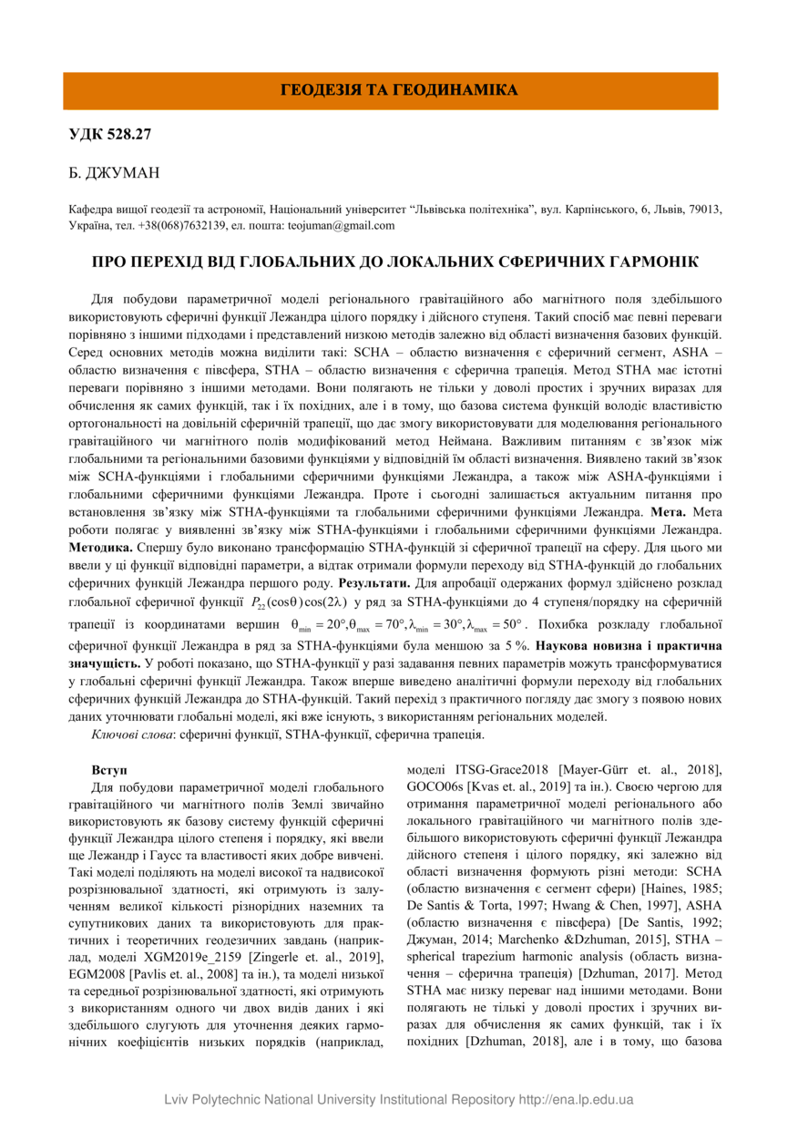 Джуман Б. Про перехід від глобальних до локальних сферичних гармонік / Б. Джуман // Сучасні досягнення геодезичної науки та виробництва. — Львів : Видавництво Львівської політехніки, 2020. — Том 1(39). — С. 57–61.