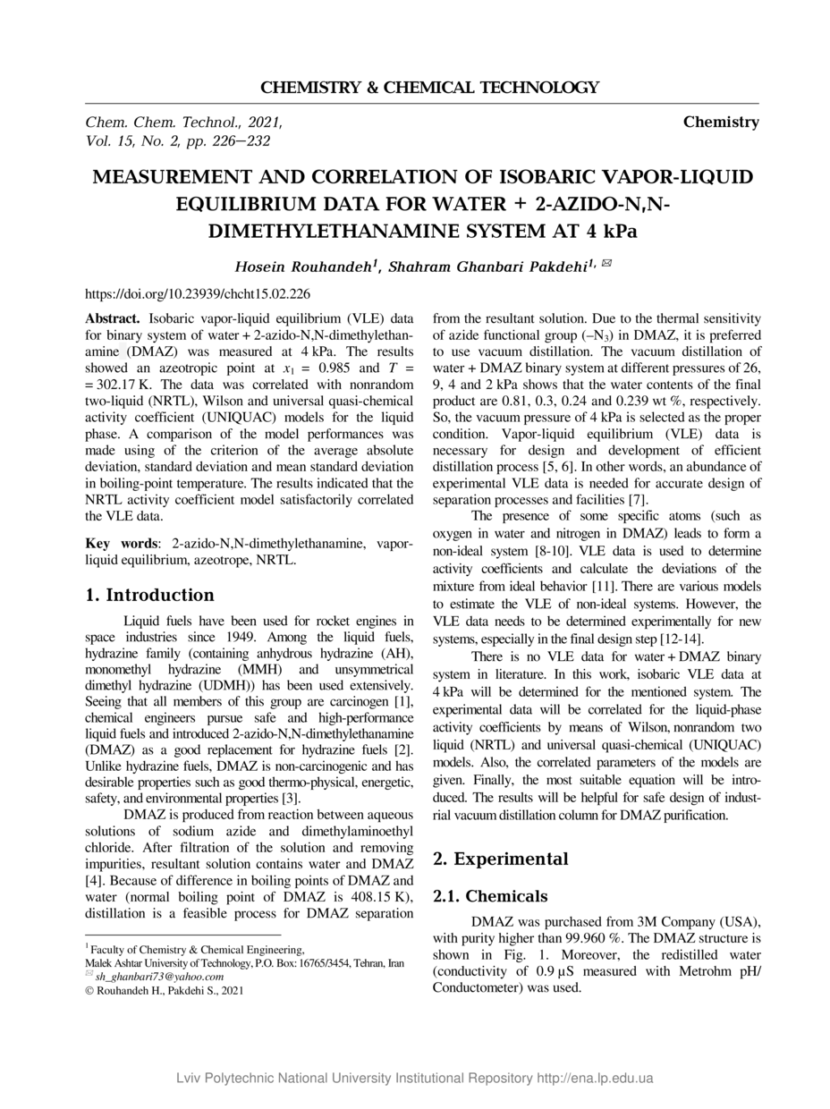 Rouhandeh H. Measurement and Correlation of Isobaric Vapor-Liquid Equilibrium Data for Water + 2-Azido-N,N-Dimethylethanamine System at 4 kPa / Hosein Rouhandeh, Shahram Ghanbari Pakdehi // Chemistry & Chemical Technology. — Lviv : Lviv Politechnic Publishing House, 2021. — Vol 15. — No 2. — P. 226–232.