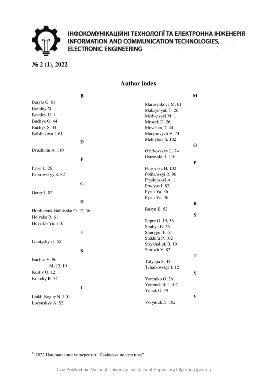 Зміст // Інфокомунікаційні технології та електронна інженерія. — Львів : Видавництво Львівської політехніки, 2022. — Том 2. — № 1. — С. 120–122.