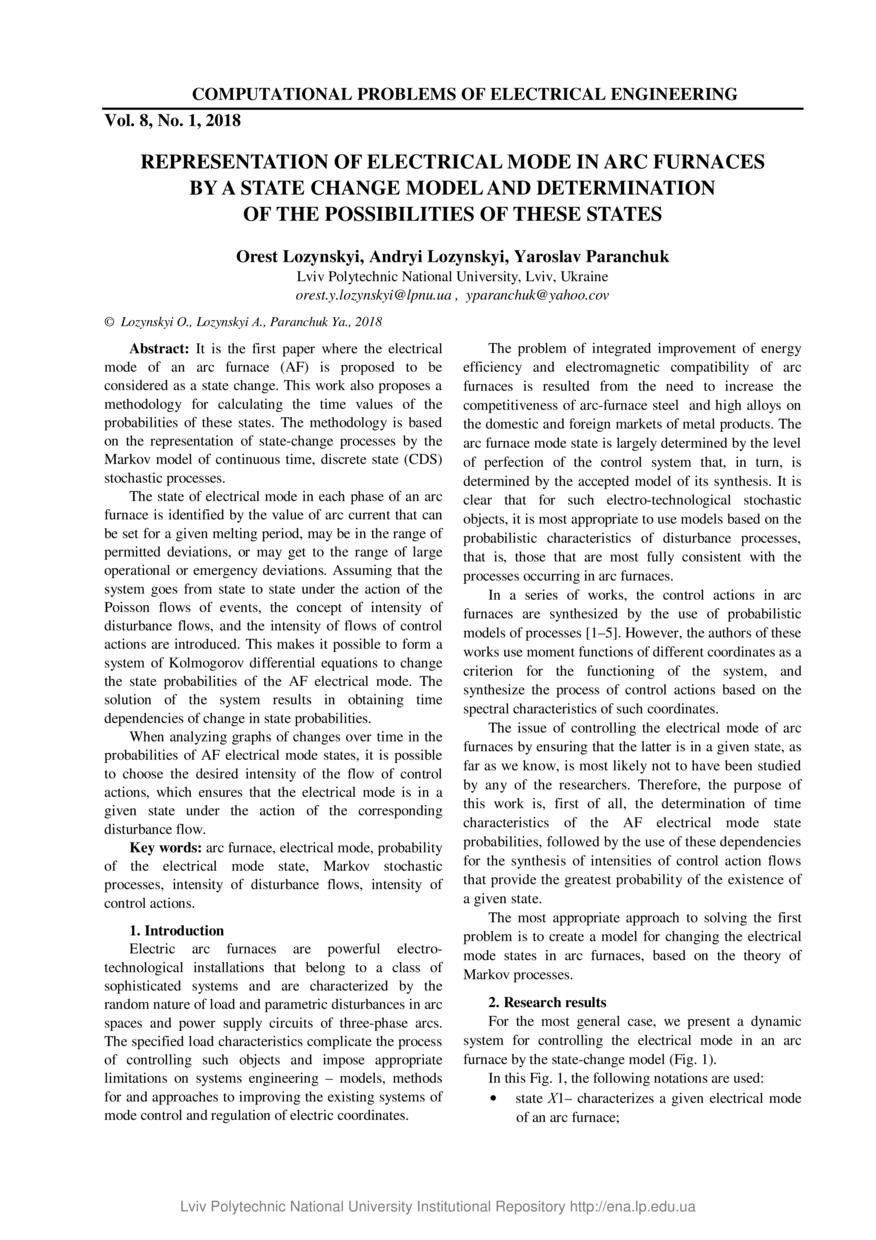 Lozynskyi O. Representation of electricalmode in arc furnaces by a state change modeland determination of the possibilities of these states / Orest Lozynskyi, Andryi Lozynskyi, Yaroslav Paranchuk // Computational Problems of Electrical Engineering. — Lviv : Lviv Politechnic Publishing House, 2018. — Vol 8. — No 1. — P. 26–30.