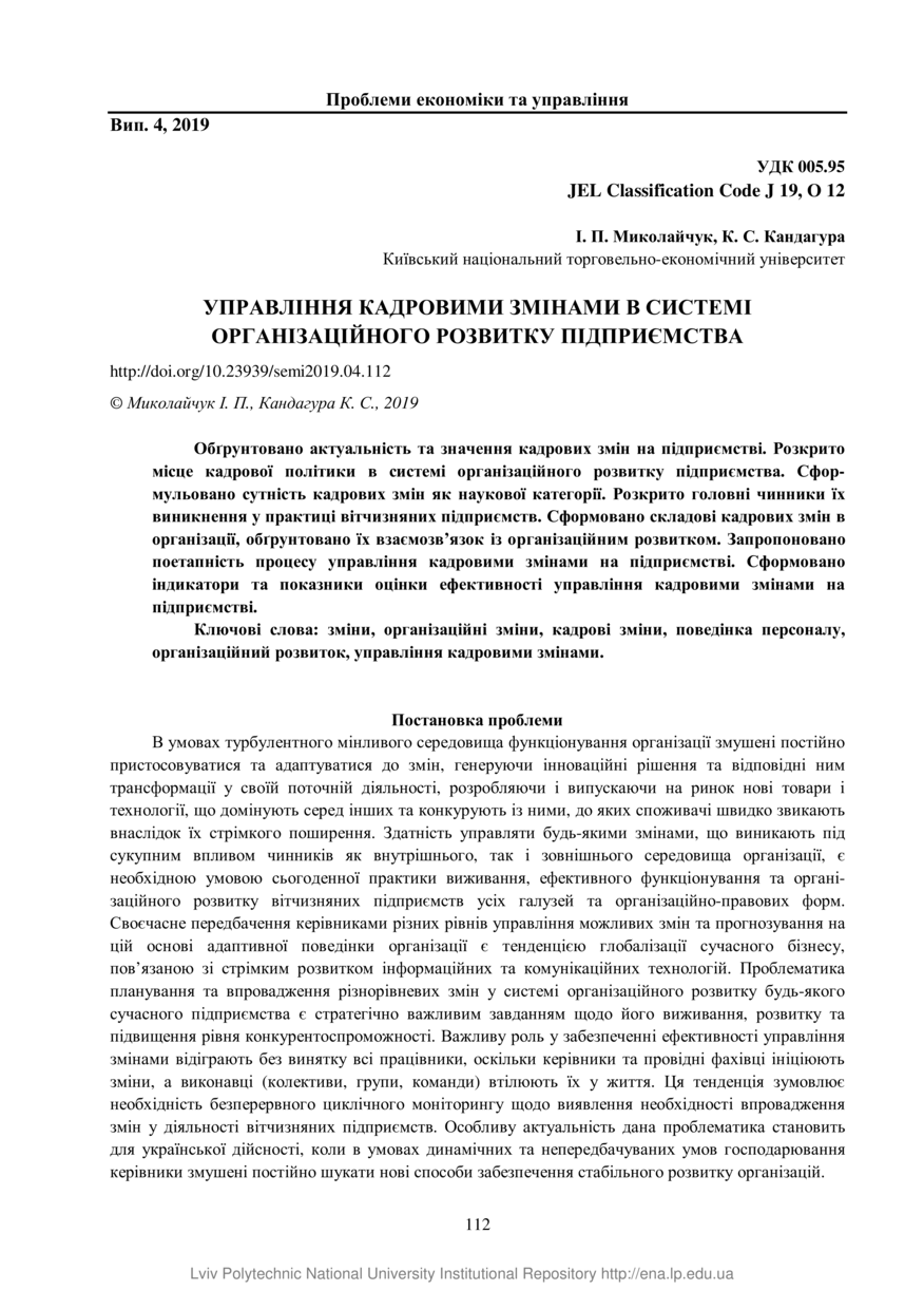 Миколайчук І. П. Управління кадровими змінами в системі організаційного розвитку підприємства / І. П. Миколайчук, К. С. Кандагура // Вісник Національного університету «Львівська політехніка». Серія: Проблеми економіки та управління. — Львів : Видавництво Львівської політехніки, 2019. — № 4. — С. 112–120.