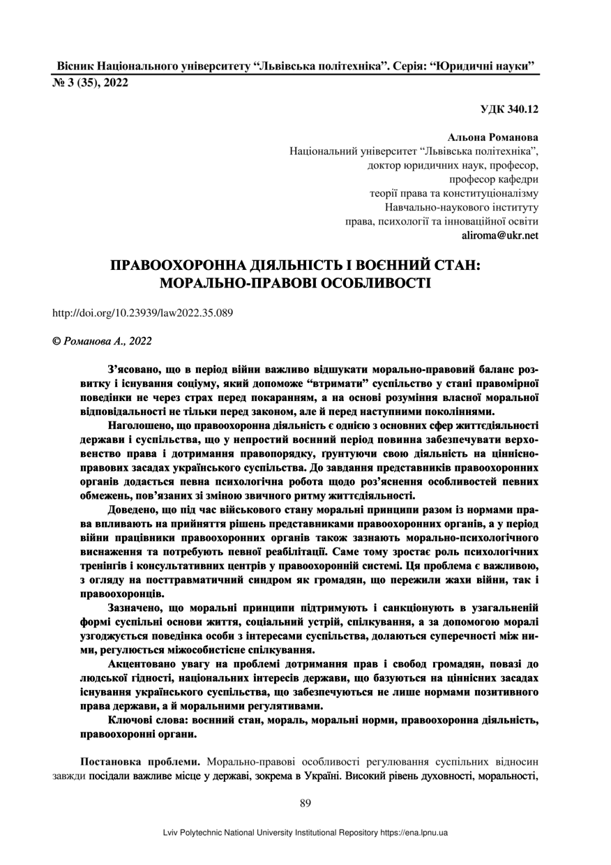 | dc.identifier.citation | Романова А. Правоохоронна діяльність і воєнний стан: морально-правові особливості / Альона Романова // Вісник Національного університету “Львівська політехніка”. Серія: “Юридичні науки”. — Львів : Видавництво Львівської політехніки, 2022. — Том 9. — № 3 (35). — С. 89–94. | |