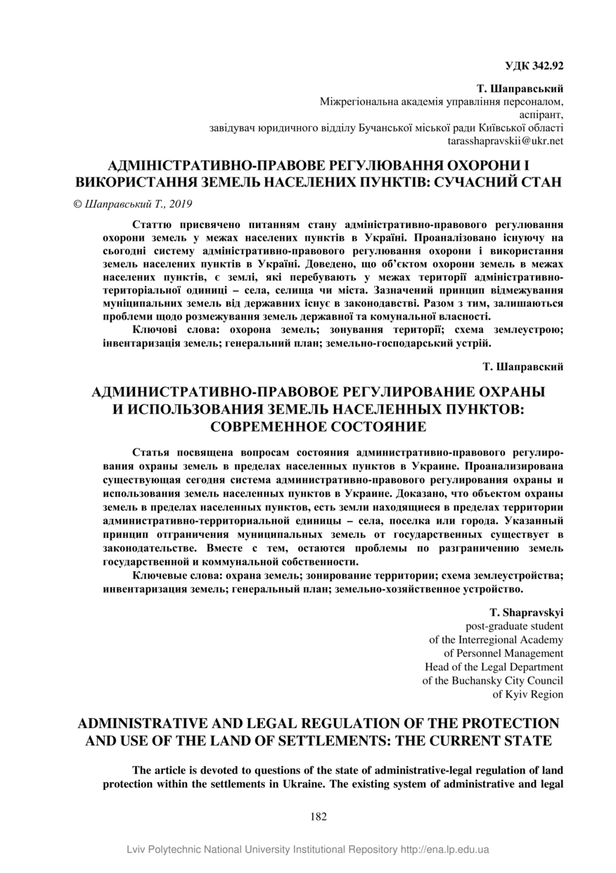 | dc.title.alternative | Administrative and legal regulation of the protection and use of the land of settlements: the current state. | |