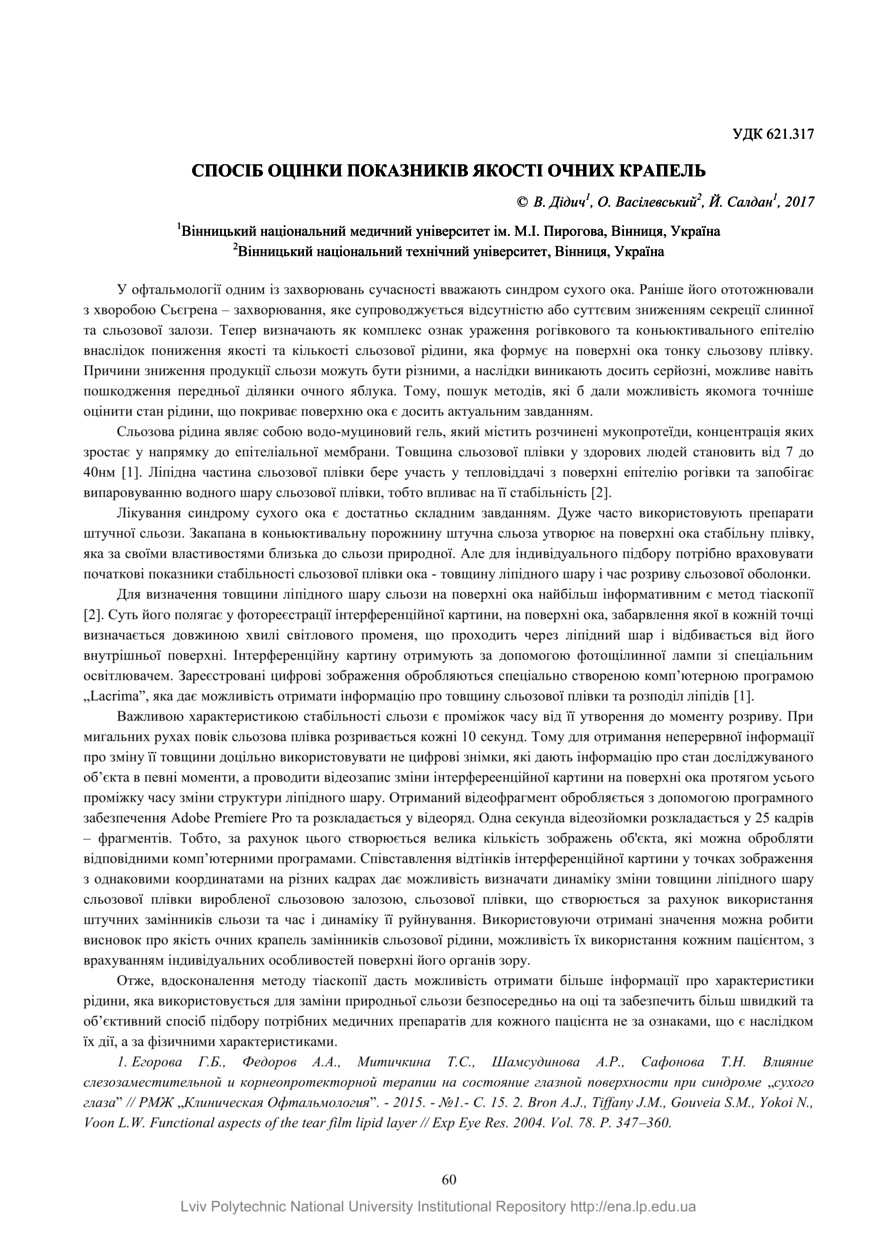 Дідич В. Спосіб оцінки показників якості очних крапель / В. Дідич, О. Васілевський, Й. Салдан // Управління якістю в освіті та промисловості: досвід, проблеми та перспективи : тези доповідей III Міжнародної науково-практичної конференції пам’яті професора Петра Столярчука, Львів, 11–12 травня 2017 року. — Львів : Видавництво Львівської політехніки, 2017. — С. 60. — (Управління якістю у сфері освіти, науки та промисловості).