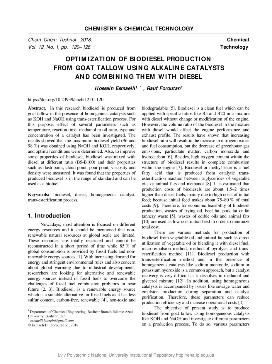 Esmaeili H. Optimization of biodiesel production from goat tallow using alkaline catalysts and combining them with diesel / Hossein Esmaeili, Rauf Foroutan // Chemistry & Chemical Technology. — Lviv : Lviv Politechnic Publishing House, 2-18. — Vol 12. — No 1. — P. 120–126.
