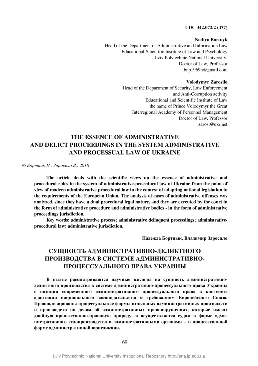 Bortnyk N. The essence of administrative and delict proceedings in the system administrative and processual law of Ukraine / Nadiya Bortnyk, Volodymyr Zarosilo // Вісник Національного університету “Львівська політехніка”. Серія: Юридичні науки. — Львів : Видавництво Львівської політехніки, 2018. — № 906 (20). — С. 69–76.