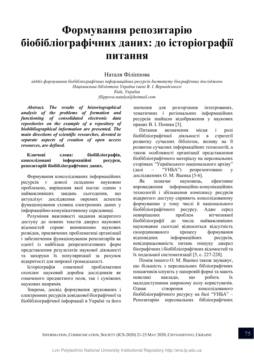 | dc.identifier.citationen | Filippova N. Formuvannia repozytariiu biobibliohrafichnykh danykh: do istoriohrafii pytannia / Natalia Filippova // Informatsiia, komunikatsiia, suspilstvo 2020 : materialy 9-yi Mizhnarodnoi naukovoi konferentsii, 21–23 travnia 2020 roku, Lviv. — Lviv : Lviv Politechnic Publishing House, 2020. — P. 75–76. — (Bibliotechna, arkhivna ta muzeina diialnist v umovakh rozvytku informatsiinoho suspilstva). | |