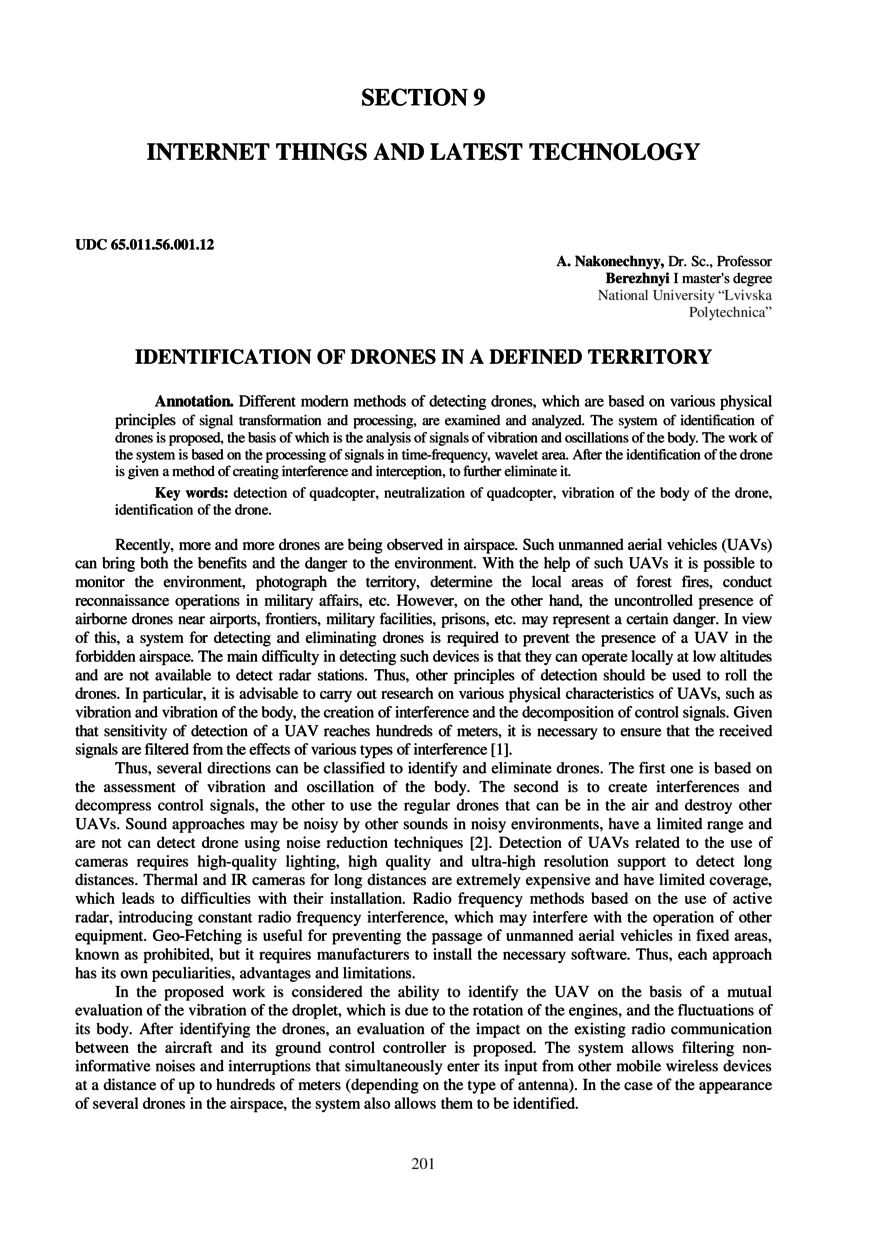 Nakonechnyy A. Identification of drones in a defined territory / A. Nakonechnyy, I. Berezhnyi // Автоматика/Automatiсs – 2018 : матеріали XXV Міжнародної конференція з автоматичного управління, 18–19 вересня 2018 року, Львів. — Львів : Видавництво Львівської політехніки, 2018. — С. 201–202. — (Internet things and latest technology).