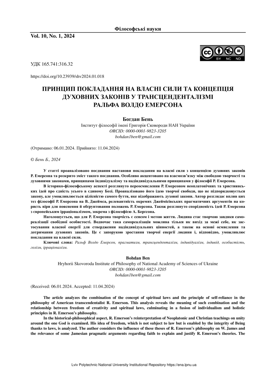 | dc.identifier.citationen | Ben B. The Principle of Self-Reliance and the Concept of Spiritual Laws in the Transcendentalism of Ralph Waldo Emerson / Bohdan Ben // Humanitarian Vision. — Lviv : Lviv Politechnic Publishing House, 2024. — Vol 10. — No 1. — P. 18–25. | |