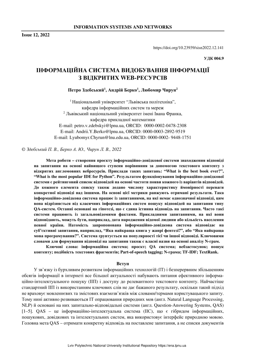 Здебський П. Інформаційна система видобування інформації з відкритих WEB-ресурсів / Петро Здебський, Андрій Берко, Любомир Чирун // Вісник Національного університету "Львівська політехніка" "Інформаційні системи та мережі". — Львів : Видавництво Львівської політехніки, 2022. — № 12. — С. 141–168.