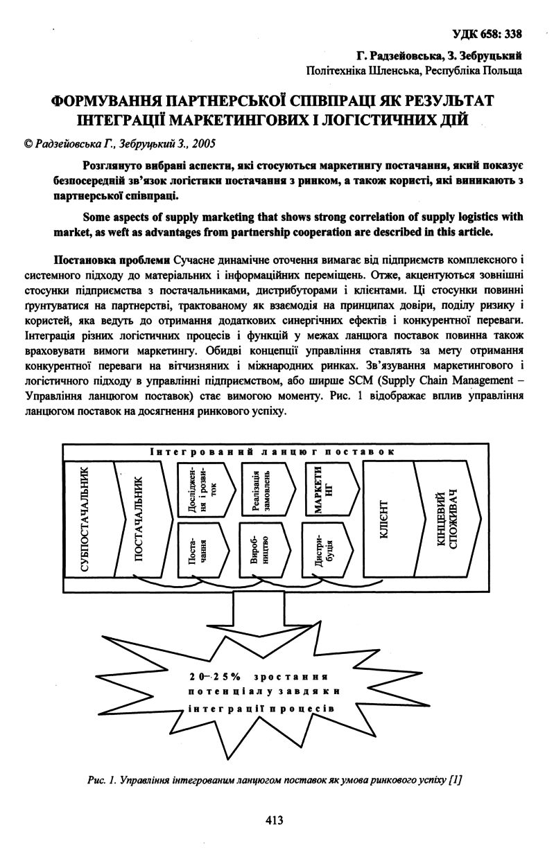 Радзейовська Г. Формування партнерської співпраці як результат інтеграції маркетингових і логістичних дій / Г. Радзейовська, З. Зебруцький // Вісник Національного університету “Львівська політехніка”. — Львів : Видавництво Національного університету “Львівська політехніка”, 2005. — № 526 : Логістика. — С. 413–421. — (Логістичне та маркетингове управління).
