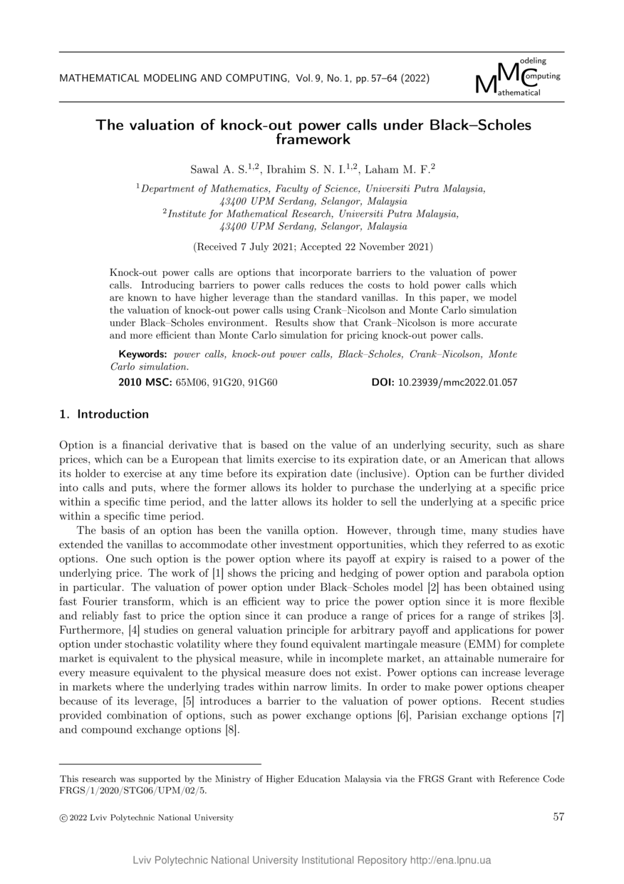 Sawal A. S. The valuation of knock-out power calls under Black–Scholes framework / A. S. Sawal, S. N. I. Ibrahim, M. F. Laham // Mathematical Modeling and Computing. — Lviv : Lviv Politechnic Publishing House, 2022. — Vol 9. — No 1. — P. 57–64.