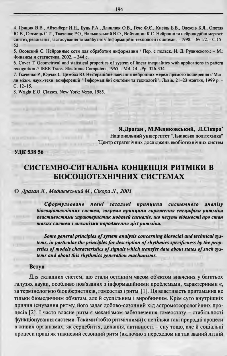 | dc.relation.referencesen | 4. Drahan Ya., Yevtukh P., Sikora JL, Yavorskyi B. Poliperiodychno korelovani vypadkovi protsesy yak adekvatni modeli kratnoi rytmiky pryrodnykh yavysh i tekhnolohichnykh protsesiv, Kompiuterni tekhnolohii drukarstva, 2000, No 4, P. 269-290. | |