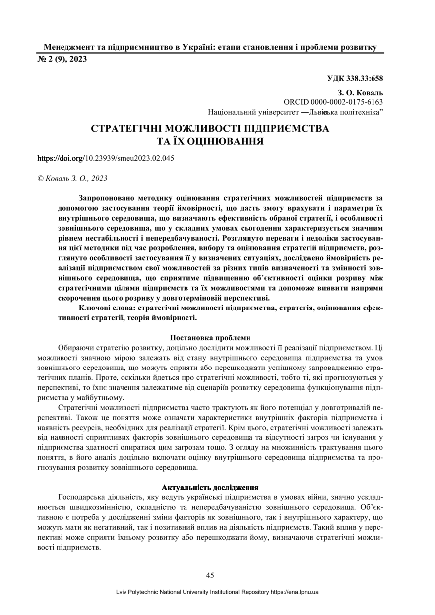 Коваль З. О. Стратегічні можливості підприємства та їх оцінювання / З. О. Коваль // Менеджмент та підприємництво в Україні: етапи становлення і проблеми розвитку. — Львів : Видавництво Львівської політехніки, 2023. — Том 5. — № 2. — С. 45–53.